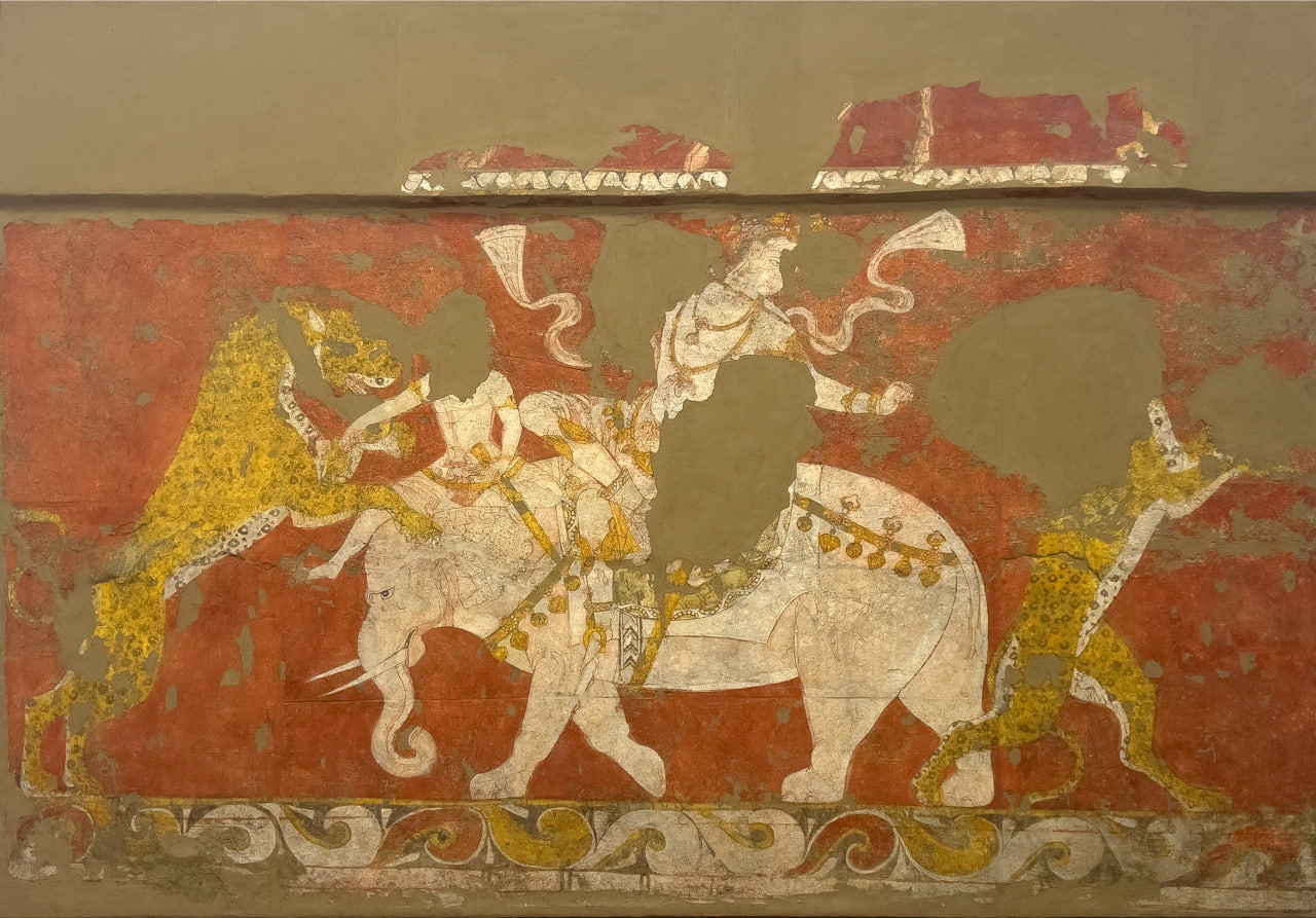 Found in the Varakhsha monument. 8th century. Fragment of the walls of the interior of the palace of the Bukhara kings. This mural depicts a Bukhara prince standing on an elephant fighting a tiger.