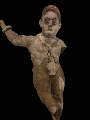 Xolchayon yodgorligidan aniqlangan bo’lib, miloddan avvalgi I asr va milodiy I asrga oid. Oyoqlari kesishgan holatda tasvirlangan. Yuqoriga ko’tarilgan o’ng qo’lida bilakuzuk aks ettirilgan. Loydan yasalgan va pishirilmagan.